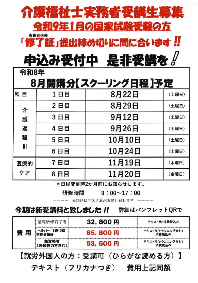 令和9年1月の国家試験受験の方、実務者研修「修了証」提出締め切りに間に合います!!